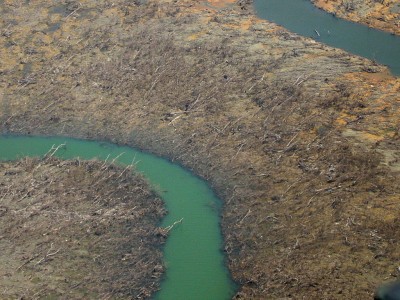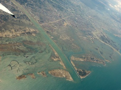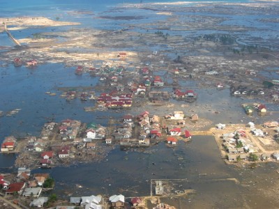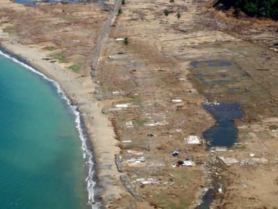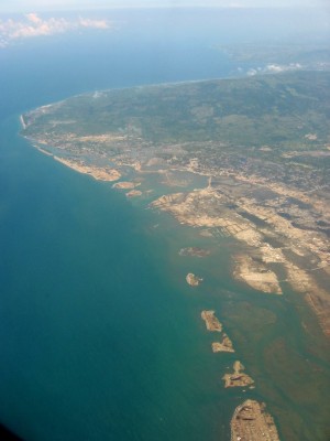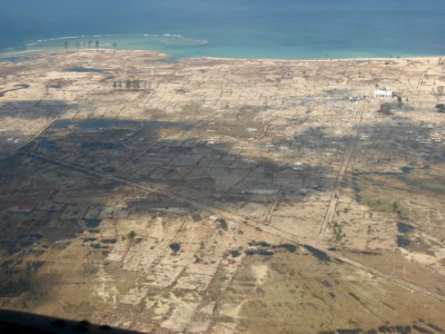 ◆上空から見た被災直後のバンダアチェ市です。元の海岸が水没し、