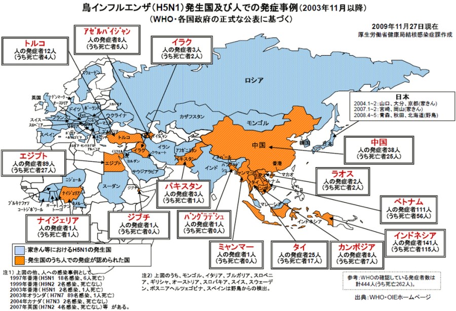 このように、鳥インフルエンザウイルスは大陸で先に大感染しており、人間の間で大感染する新型インフルエンザへの変異も大陸(アジア)で最初に発生する可能性が高いとみられています。そして、感染者が来日して日本にも広まるという筋書きが想定されているのです。