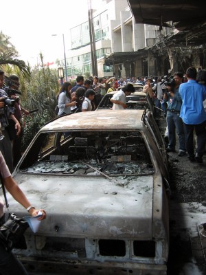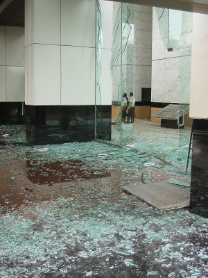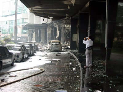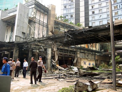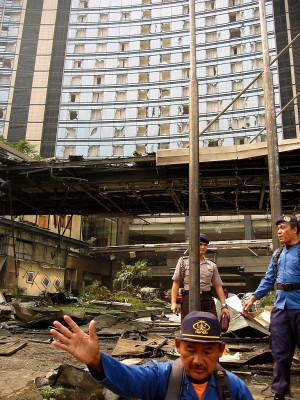 いずれも2003年にインドネシアの首都ジャカルタで起きた自爆テロを現場で撮影した写真です。米国系の最高級ホテル「JWマリオット」が爆破されました。爆発の大きさの割には少ない死傷者数でしたが、1階からの爆風で30階以上の階の窓ガラスが割れるほどの大変な破壊力でした。